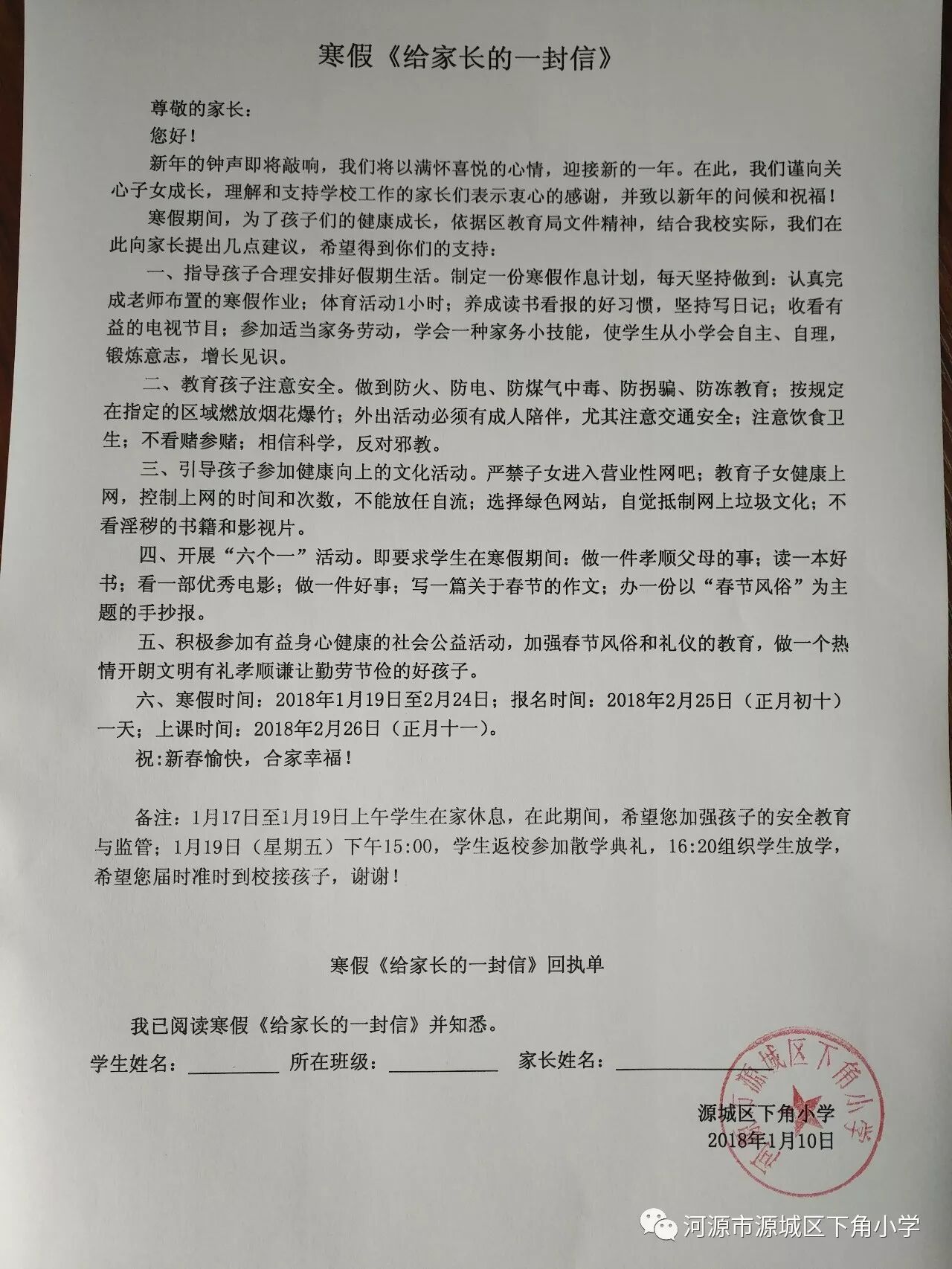 寒假期间,为了孩子们的健康成长,依据区教育局文件精神,结合我校实际,我们在此向家长提出几点建议,希望得到你们的支持: